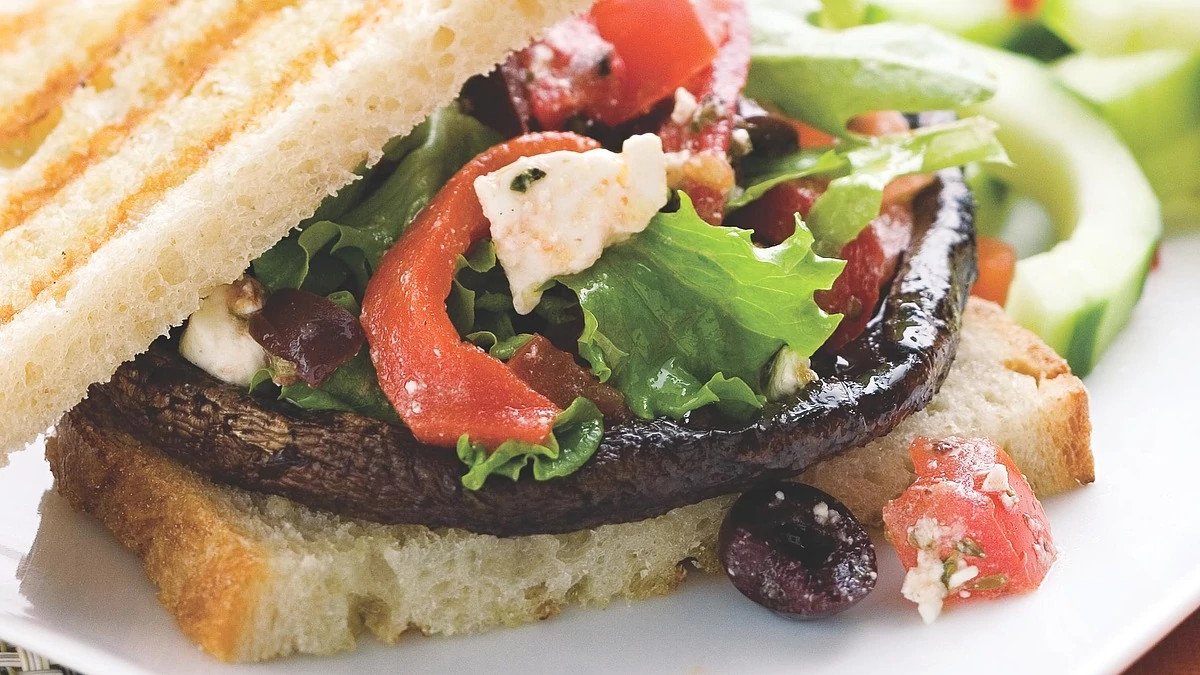 This mushroom sandwich comes topped with a luscious Greek-style salad